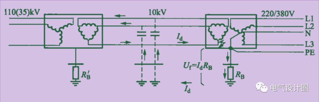 而低压配电的系统接地与高压配电装置的保护接地往往是共用的接地极的,所以低压侧PE线对地电位也升高至40V,这个值小于人身电击的预期故障接触电压限值50V,从而当高压侧发生接地故障时引起低压侧电击事故的几率会很小。
